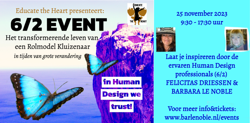 Educate the Heart organiseert 25 november 2023 een Human Design 6/2 evenement op een mooie locatie centraal in Nederland, exclusief voor iedereen met het 6/2 of 6/3 profiel.